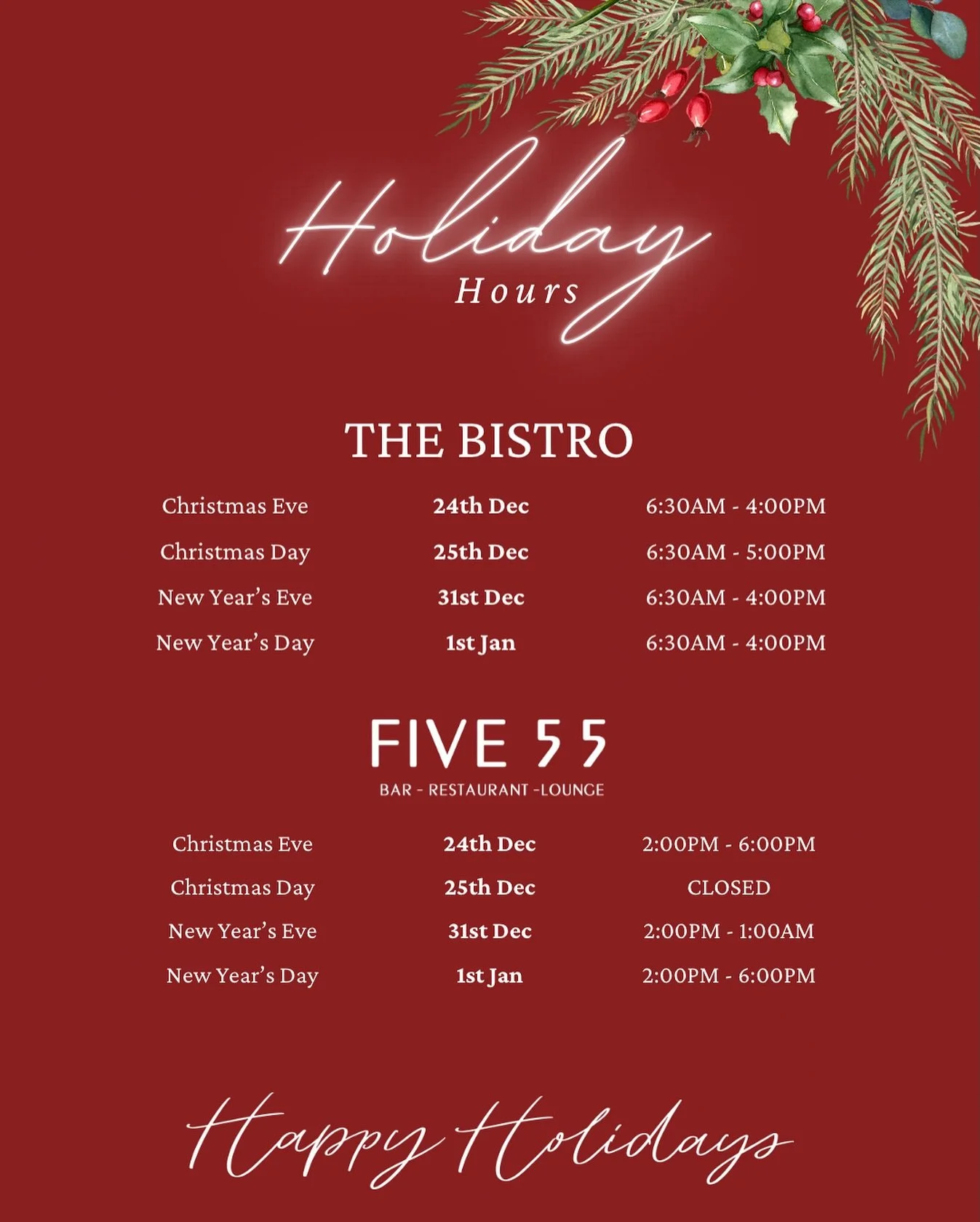 At the FIVE 55, we believe in the power of good food and well-crafted drinks to bring people together. We're committed to providing an experience that goes beyond the plate, fostering an environment where moments are savored, and every guest leaves happy and full.